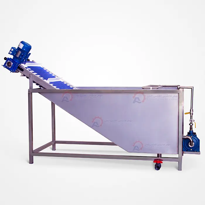 وزن این دستگاه 300 کیلوگرم است و ابعاد آن طول 200 سانتیمتر، عرض 100 سانتیمتر و ارتفاع 80 سانتیمتر می باشد. ظرفیت دستگاه 500 لیتر است. بدنه دستگاه از آلیاژ و استنلس استیل تشکیل شده است. سیستم آب این دستگاه ها سیستم چرخشی و سیرکولاسیون می باشد. این دستگاه دارای خروجی برای آب جمع شده در آن هستند. تا زمانی که دستگاه روشن باشد، کار می کند. چیزی حدود 500 کیلوگرم در ساعت را شستشو می دهد. این دستگاه دارای یک نوار نقاله هم می باشد که محصولات را پس از شستشو از دستگاه خارج می سازد. بدنه دستگاه باید از جنس استیل ضد زنگ باشد تا در برابر رطوبت و زنگ زدگی مقاوم باشد.